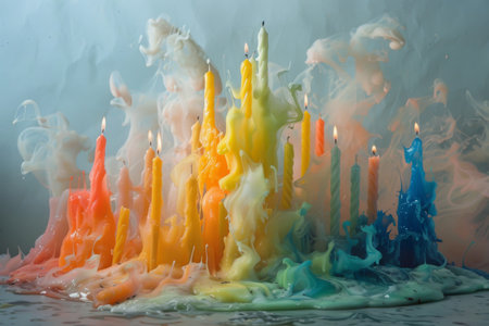 An array of colored crayons melting into vibrant pools of wax on a sleek, dark surface