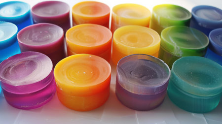 A bright and artistic arrangement of colorful square soaps creating a vibrant gradient effect. Perfect for wellness and beauty themes.