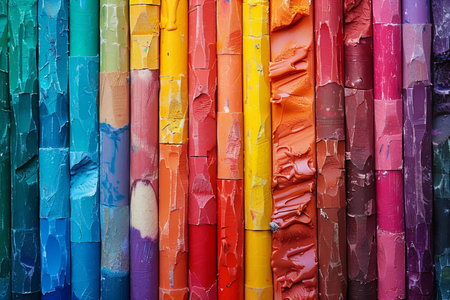 Colorful crayons arranged in an intricate pattern, creating vibrant colors on the background. the rainbow of wax shades is displayed from above.