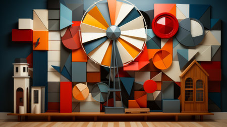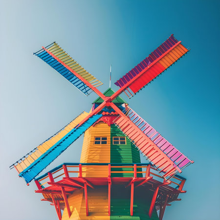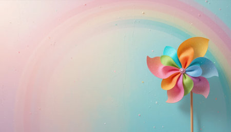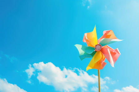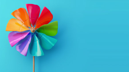 Closeup of colorful pinwheel twirls gracefully in the wind, reminding viewers of the joys of travel, summer holidays, and vacation time.