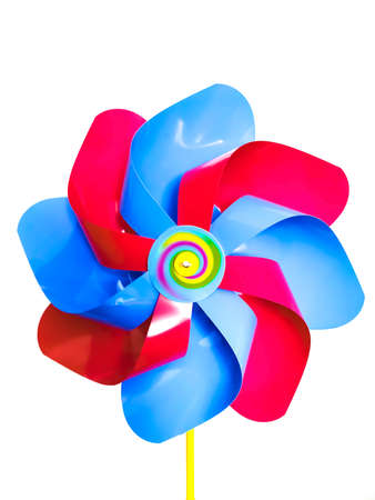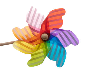Pinwheel isolated on white background. Rainbow color windmill toy on a wooden stick