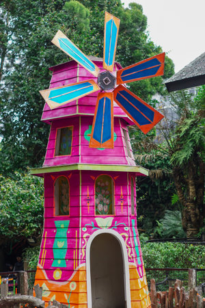 A colorful windmill structure surrounded by lush greenery in a playful setting.