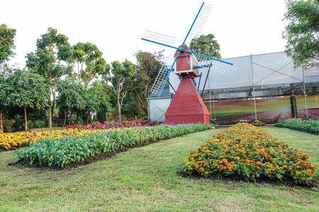 Beautiful windmill under the blue sky, the foreground is blooming flowers