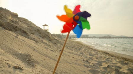 Wind blowing gently, a pinwheel turns on a sandy beach, capturing the spirit of summer holidays, beach tourism, and adventure.