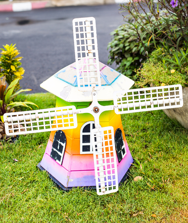 Decorative wooden windmill in the garden. Carving art. Architectural element