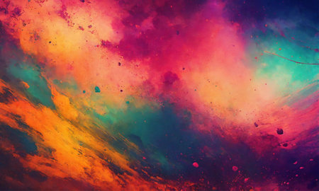A burst of colorful paint particles disperses in all directions against a dark background, forming a stunning display of vibrant hues and dynamic patterns.