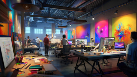 Discover a modern workspace showcasing vibrant wall art, comfortable seating, and an inviting atmosphere, perfect for collaboration and creativity in a professional environment.