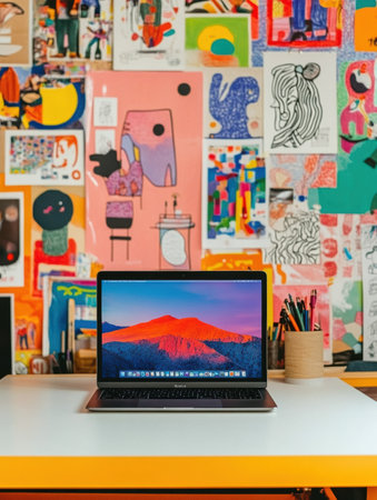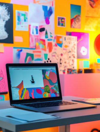 A laptop sits on a desk surrounded by vibrant art pieces, providing an inspiring and creative workspace atmosphere for productivity.
