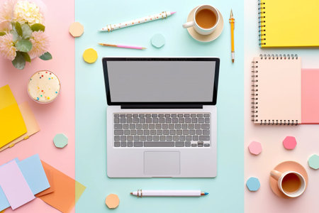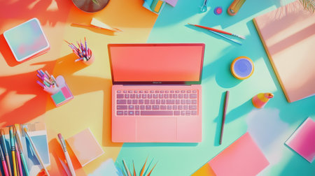 A modern laptop sits on a vibrant desk, surrounded by various stationery items and a colorful background, creating an inviting workspace.