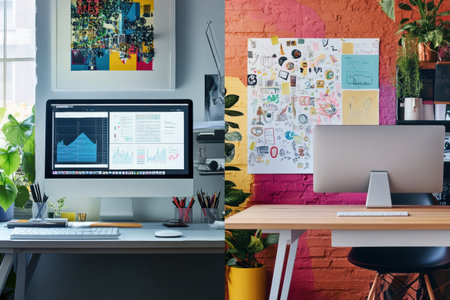 Bright and modern workspace featuring colorful wall design, indoor plants, and sleek furniture. Ideal for inspiring creativity and productivity in urban settings.