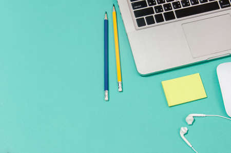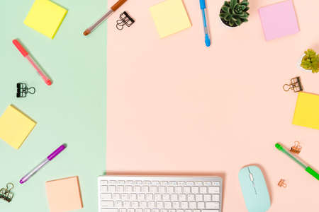 Minimal work space - Creative flat lay photo of workspace desk. Top view office desk with keyboard, mouse and adhesive note on pastel green pink color background. Top view with copy space photography.