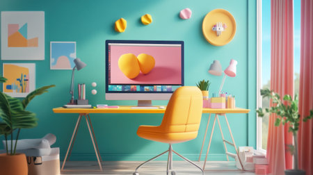 Modern office interior with computer, supplies and colorful wall. 3D Rendering