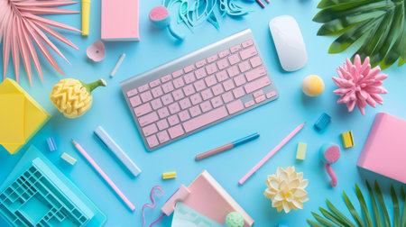 Top view of a pastel-themed workspace setup with various office supplies on a blue background, creating a cheerful and organized environment.