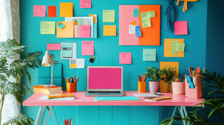 Vibrant Workspace Oasis: A Colorful Desk with Plants and Office Supplies