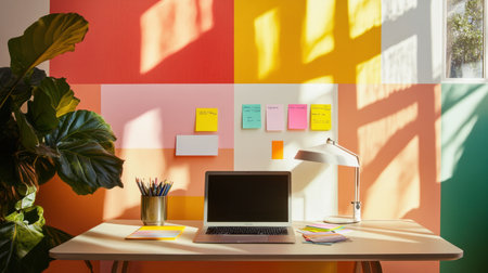 Bright and inviting workspace showcasing a laptop, colorful wall design, and greenery. Ideal for creative professionals seeking inspiration and productivity.