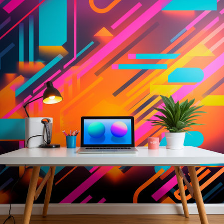 A vibrant and abstractly decorated desk with geometric shapes, a laptop, and creative supplies in a colorful setting.