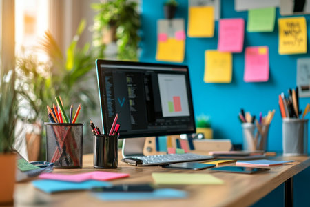 A vibrant home office setup features a sleek computer display surrounded by colorful sticky notes and stationery. Lush plants enhance the atmosphere, promoting productivity and inspiration.