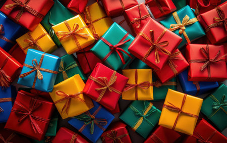 A vibrant collection of colorful gift boxes adorned with ribbons showcases the joy of giving and celebration, perfect for special occasions and festive events.