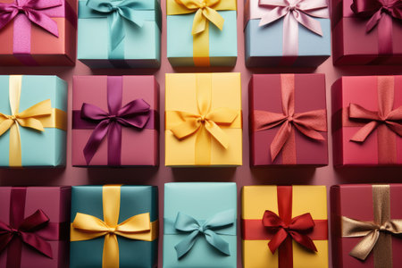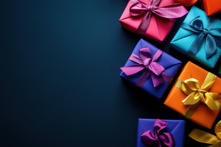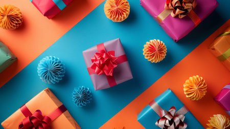 Colorful gift boxes in various sizes are scattered across a flat surface, creating a joyful and festive atmosphere perfect for celebrations.