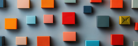 A vibrant and colorful flat lay of square boxes arranged in a grid pattern, showcasing a variety of hues perfect for background or design use.