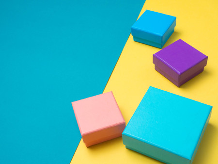 A vibrant assortment of square and rectangular gift boxes in pink, yellow, red, gray, and pastel colors create a festive packaging display. Perfect for holidays, celebrations, gift giving, and promotional displays.