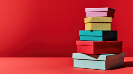 A pile of various colored boxes is arranged against a plain red backdrop. The boxes are in shades of pink, yellow, blue, and red. The composition features strong overhead lighting, creating shadows. This image is suitable for commercial use in projects related to gifts, events, or packaging.