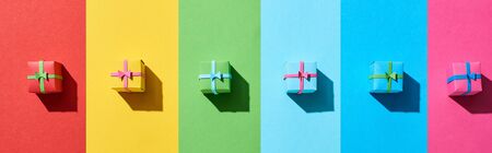 top view of multicolored gift boxes on rainbow background, panoramic shot