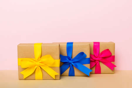 Beautiful gift boxes wrapped in colored wrapping paper with ribbon bows. Top view