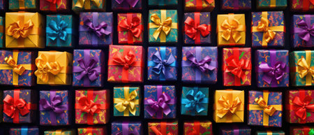 Colorful wrapped gift boxes with shiny ribbons are making a festive background for advertising or other concepts.