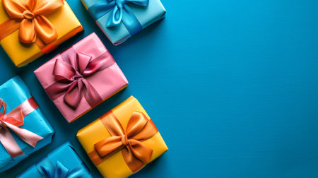A delightful arrangement of colorful gift boxes with ribbons on a soft blue surface, ideal for showcasing festive occasions and adding charm to celebrations.