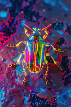 Neon lit beetle on psychedelic ground, vivid colors, fantasy insect.