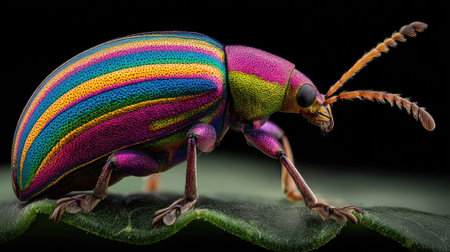 A colorful beetle with a black background, AI