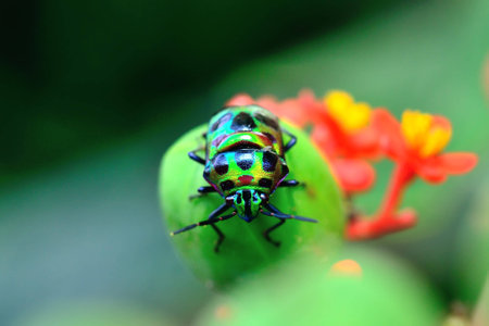 Macro Closeup of a Vibrant Iridescent Jewel Bug Scutelleridae on a Green Leaf Showcasing its Brilliant Metallic Colors