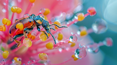 Close-Up Macro of Dew-Covered Insect Absorbing Nutrients from Beautiful Flower Petal in Nature