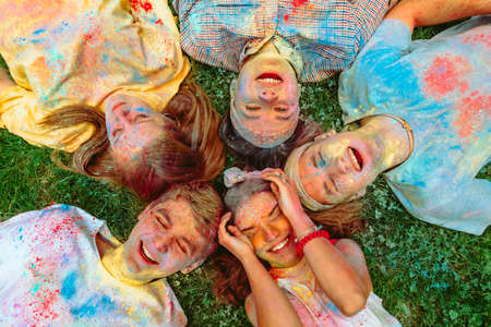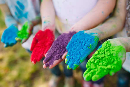 Funny kids face in color splash, coloured powder on children body. Cheerful friends showing hands painted in bright colors. Colorful dirty people.