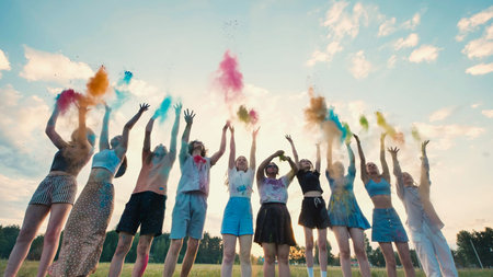 Group of young students throwing colorful holi powder in the air, celebrating the end of school year