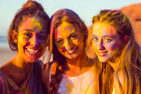 Funny girls are sprinkled with multi-colored powder. Holi holiday.