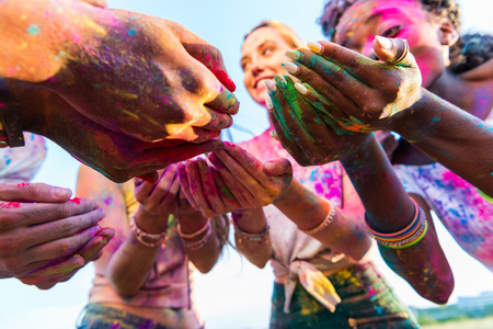 Friends putting their hands together in a sign of unity and teamwork. Holi colors festival. Friendship concept