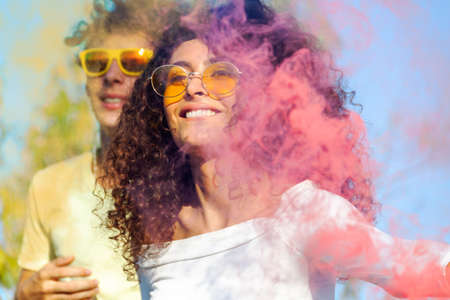 Beautiful young woman hold light up colored smoke bombs - Happy friends having fun in the park with multicolored fog bombs - Young students celebrating spring break together. Holi festival concept.