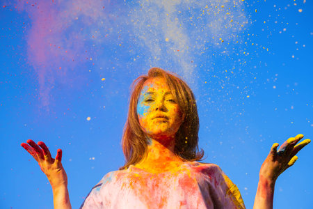 Woman covered in holi powder against blue sky. Holi colors festival.