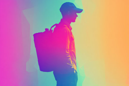 Colorful gradient overlays create an energetic backdrop featuring a delivery worker silhouette, capturing the essence of urban delivery services in motion.