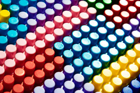 children's play background: the plane of plastic multi-colored bricks, blur, selective focus