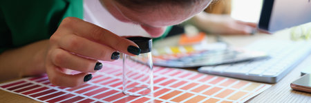 Graphic designer looking at colors samples through loupe