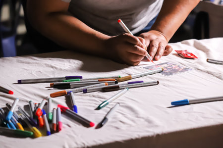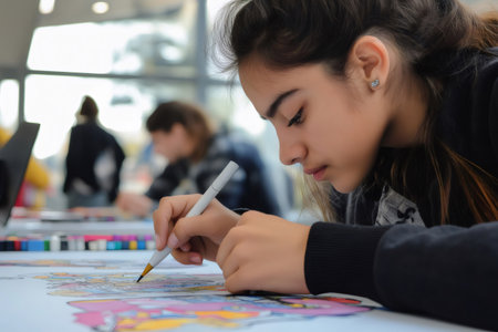 Concentrating on her colorful poster, a young female student is skillfully drawing with markers, showing her creativity and artistic talent