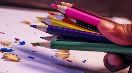 Hand holding multi colour wood pencils and shavings with combination of black and white background.