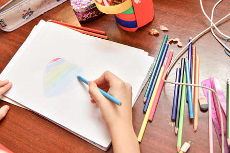 The child draws a heart on paper with colored pencils at home at the table.