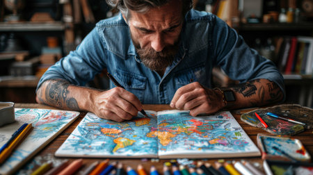 Man intensely working on a colorful world map drawing with pencils at a wooden table, showing creativity and concentration in an artistic environment.