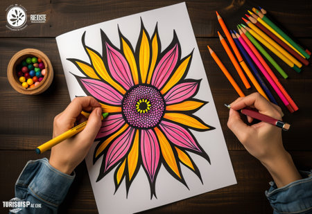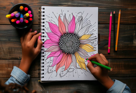A hand is coloring a vibrant, large flower drawing with markers. Pink, yellow, orange, and black hues dominate the artwork, alongside coloring pencils and markers on the wooden surface.
