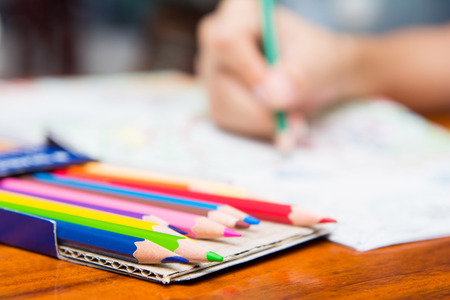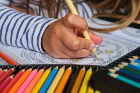 The girl makes a coloring with multi-colored pencils, close-up on hand. Home art hobby.