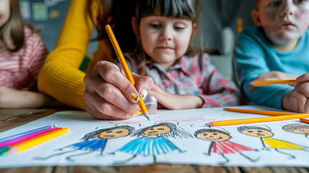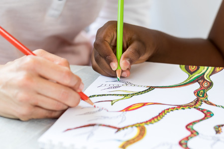 Detail of caucasian teacher drawing together with african little girl.Two hands creating sketch with color pencils.